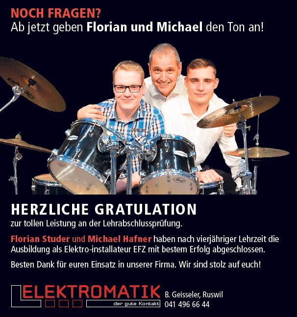 Florian Studer und Michael Hafner haben nach vierjähriger Lehrzeit die Ausbildung als Elektroinstallateur EFZ mit bestem Erfolg abgeschlossen.